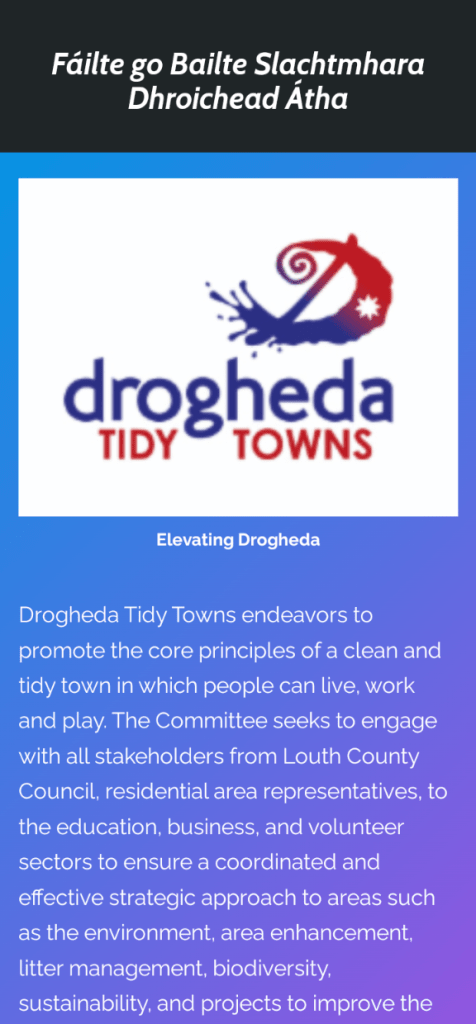 We are delighted to say we have finally launched the Drogheda Tidy Towns website. The website is going to be a game-changer for Drogheda Tidy Towns on how we update the Drogheda Community on all ongoing projects and new projects going forward.