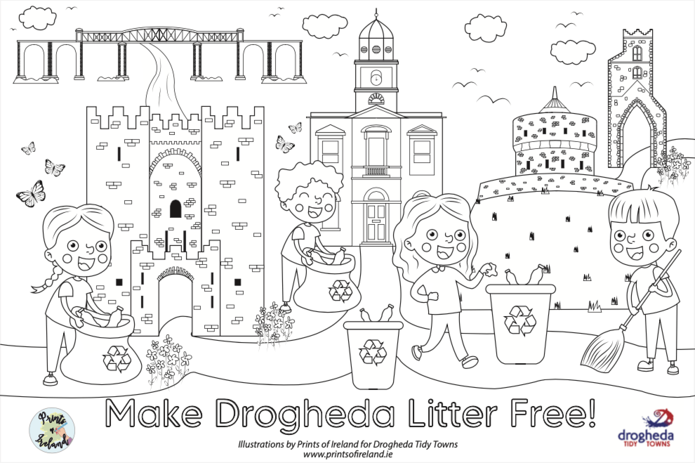 To celebrate all our Drogheda Tidy Towns volunteers, members, and partners we have worked with the locally born artist Heather Gilroy from Prints of Ireland to illustrate Drogheda Tidy Towns colouring pages to be shared with local parents, teachers, and schools of Drogheda.
