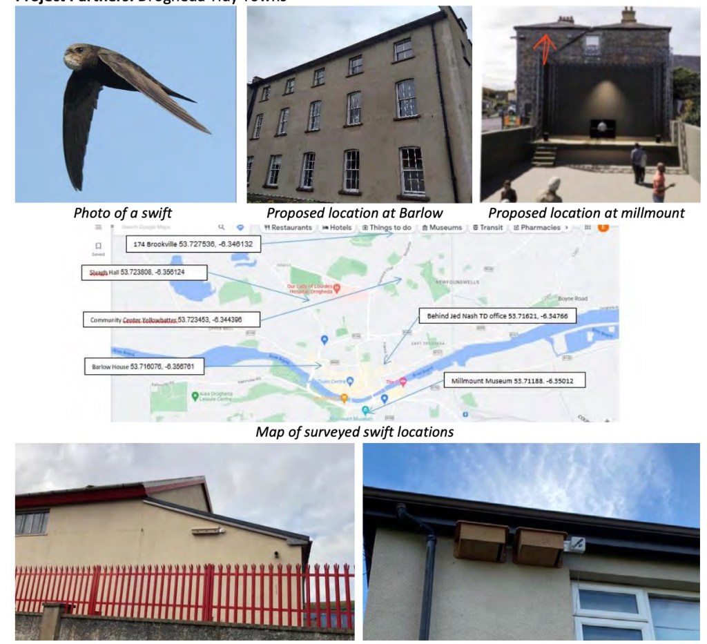 The Louth Swift Group is a voluntary organisation dedicated to the preservation of the Common Swift (Apus apus) bird in county Louth. Their aim was to identify existing nesting locations and were possible build and erect Swift nest boxes at designated sites. A survey was carried out in the summer of 2022 to identify existing nest sites.